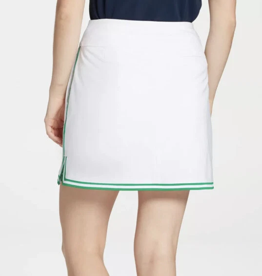 Design: Skort com barras listradas em verde e fendas laterais para mobilidade.